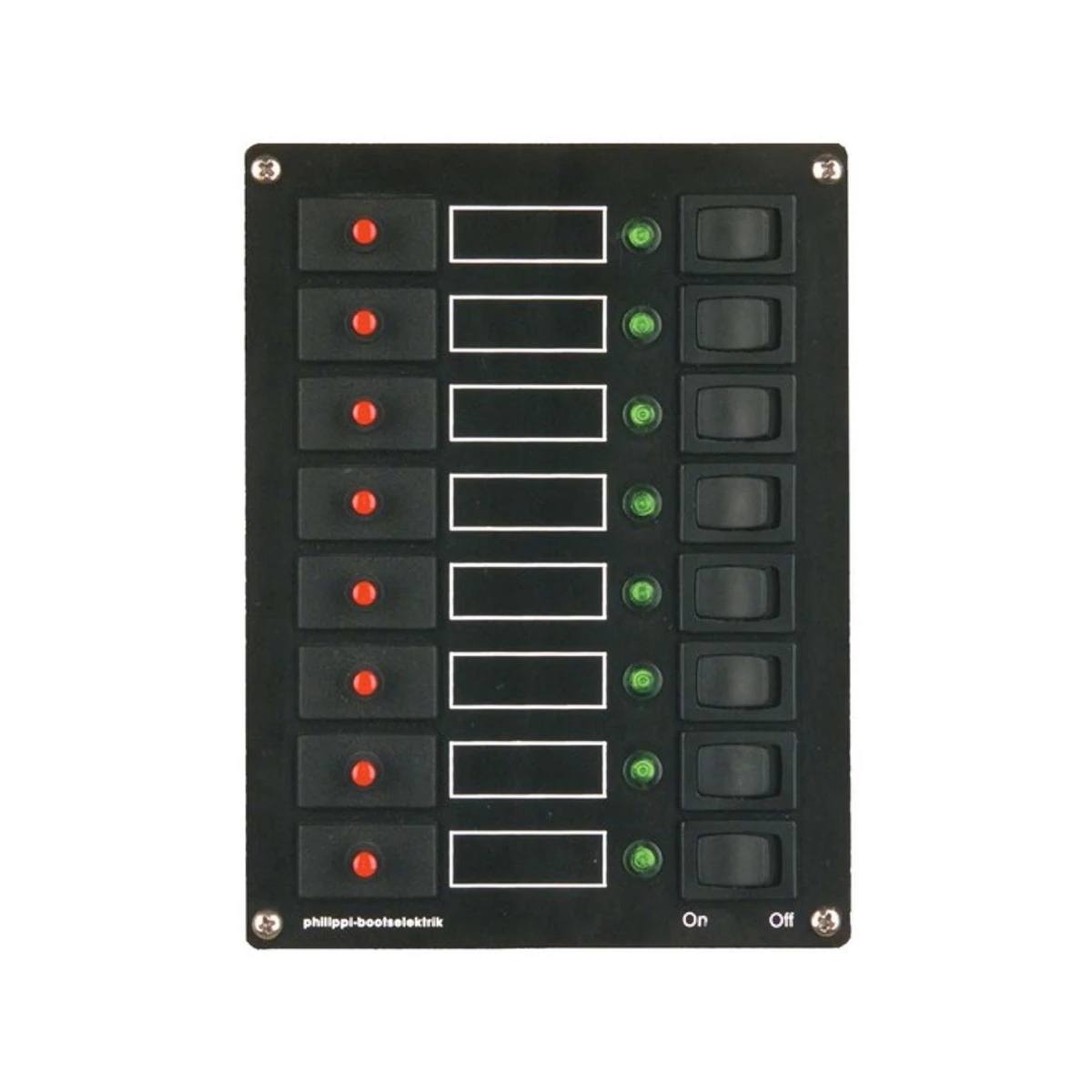 8 Stromkreise mit thermischen Schutzschaltern 8 A, Leuchtdiodenanzeige, Wippschaltern.