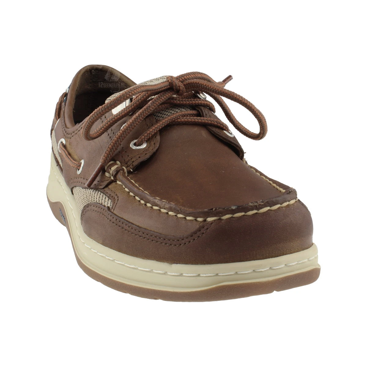 Weitere Bootsschuh-Details sind die klassische Rundschnürung für einen guten Sitz, und die korrosionsbeständigen Ösen, die dafür sorgen, dass der Schuh die Seeluft auf Törns gut übersteht.
