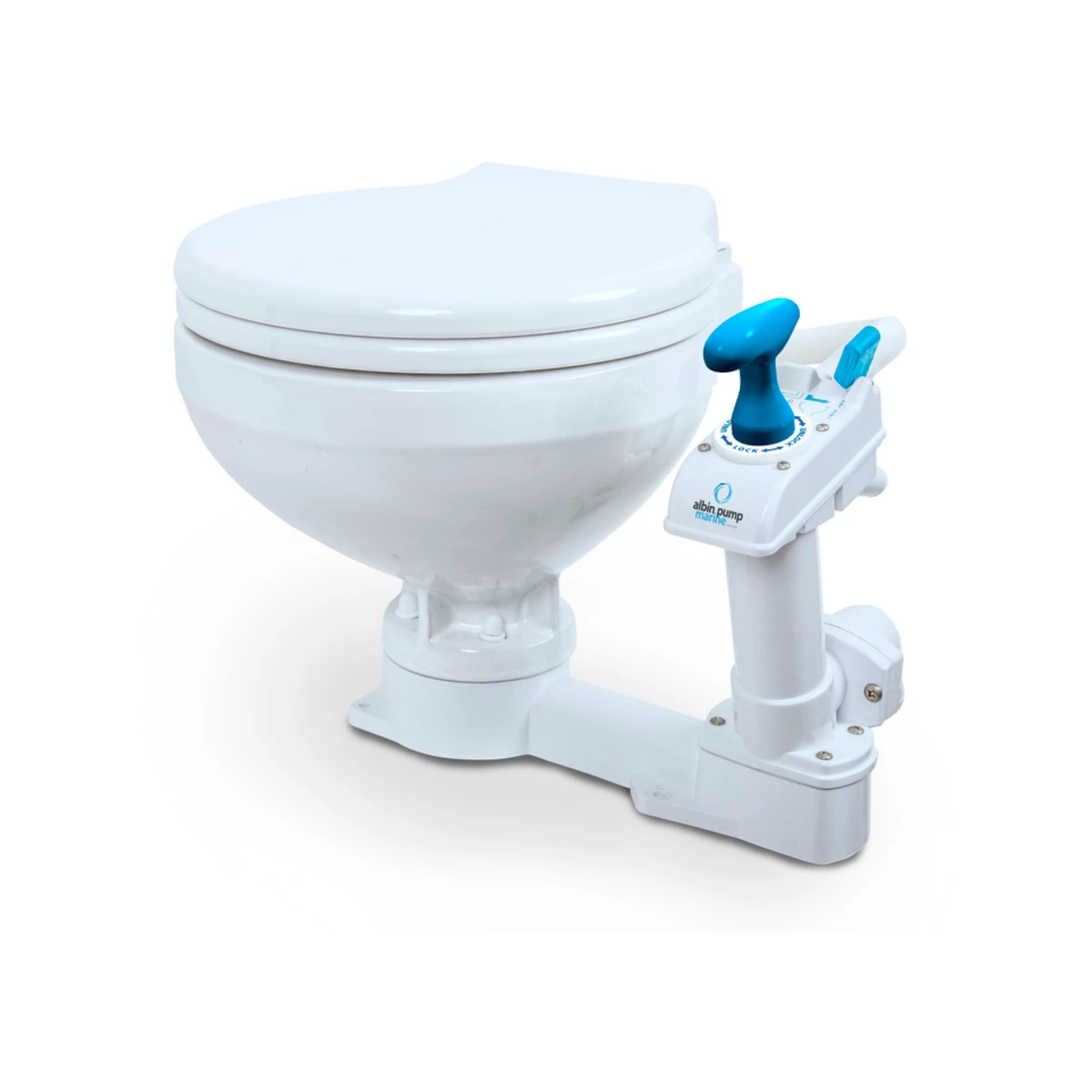 Manuelle Komforttoilette. Leicht zu reinigendes weißes Keramikbecken, weißer thermoplastischer Softclose-Sitz und manuelle ergonomische Spülpumpe mit Griff, der links oder rechts montiert werden kann. Stabile Basis für robuste Installation. Plug & Play / austauschbar mit Jabsco 29120-3000, Johnson Pump 80-47230-01 und anderen manuellen Komforttoilettenmodellen.